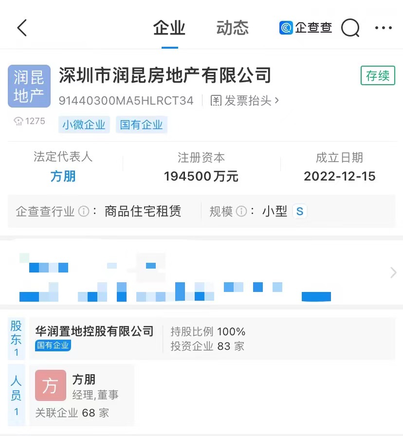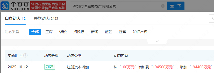 近日,深圳市润昆房地产有限公司发生工商变更,注册资本由100万元增至19.45亿元,增幅194400%。企查查显示,该公司成立于2022年12月,法定代表人为方朋,由华润置地控股有限公司全资持股。